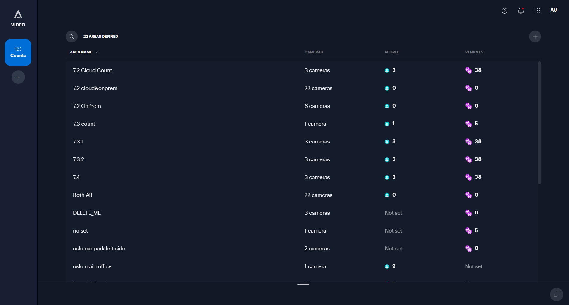- Live monitoring: View count data directly within the Counts tool, or enable "Object count" layers in Video view and Maps to see real-time statistics overlaid on your camera feeds and floor plans.